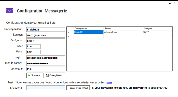 PROLAB LIS vous offre la possibilité d’envoyer automatiquement les résultats d’analyse à vos patients par e-mail. Pour activer cette fonctionnalité, vous devez configurer votre messagerie électronique. Nous préconisons l’utilisation d’une adresse de messagerie gratuite Gmail.