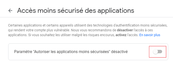 Assurez-vous que l’option connexions moins sécurisées est activée. Pour cela cliquez sur le lien Gmail en bleu :