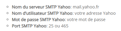 Si votre email est sur d’autres serveurs que Gmail, vous pouvez trouver sa configuration en tapant sur Google le nom du serveur et le mot : SMTP configuration, par exemple : Yahoo configuration SMTP :
