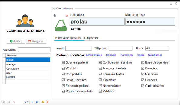Sur Prolab, LIS, vous pouvez créer un nombre illimité de comptes utilisateur, leur attribuer des privilèges spéciaux et les modifier à tout moment depuis un compte administrateur.
