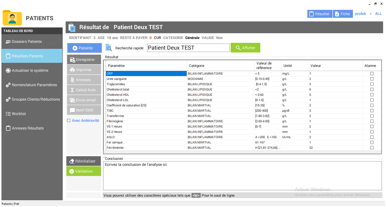 Une fois l’analyse terminée, vous avez la possibilité de saisir la valeur du résultat pour chaque paramètre manuellement, mais si vous avez connecté des automates dans votre réseau, les résultats seront remplis et enregistrés instantanément au moment de la réception, vous n’aurez qu’à remplir la conclusion et valider l’analyse.